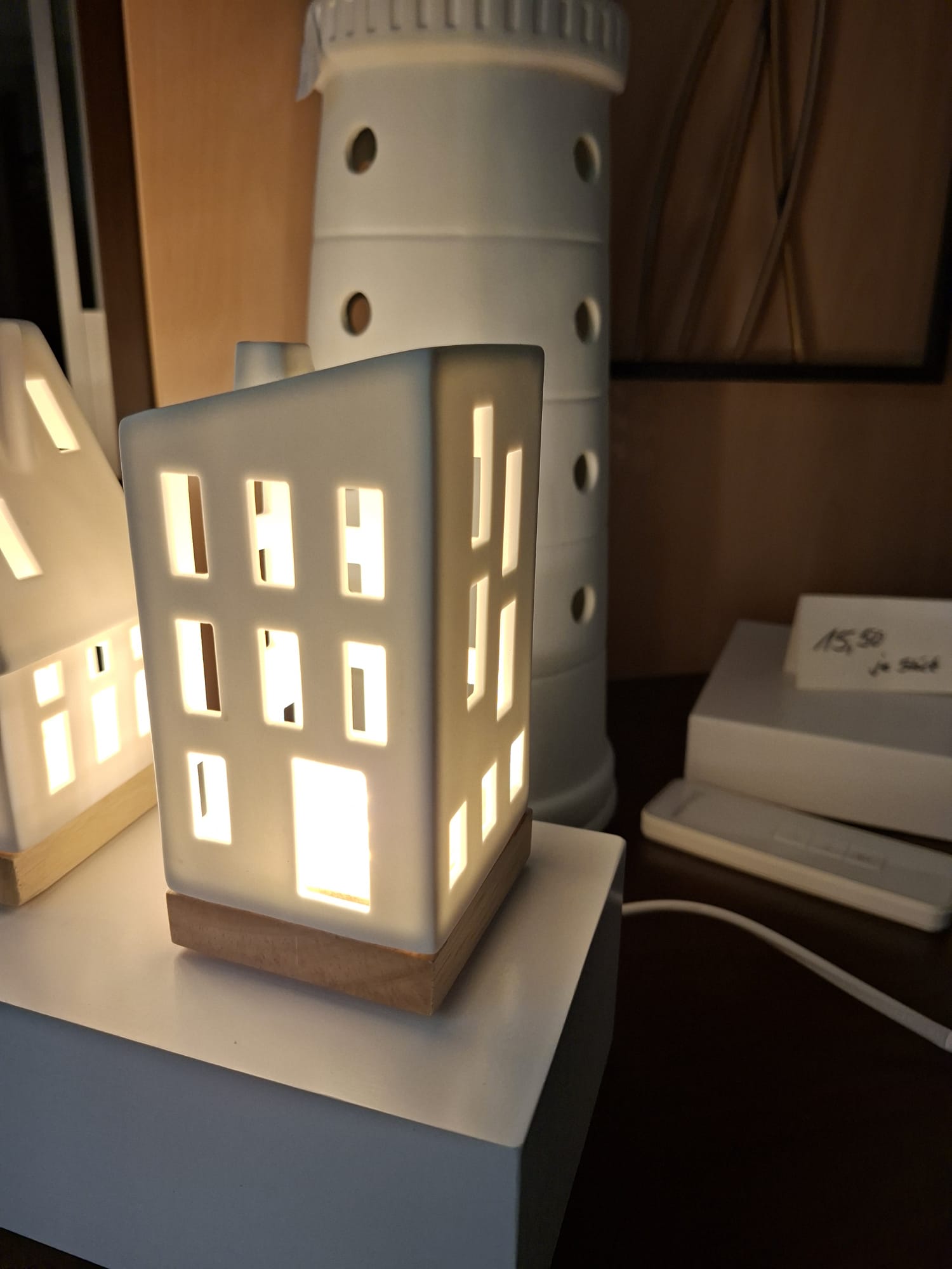 Keramikhaus mit Holzsockel mit Teelichteinsatz und Originalverpackung (Karton).