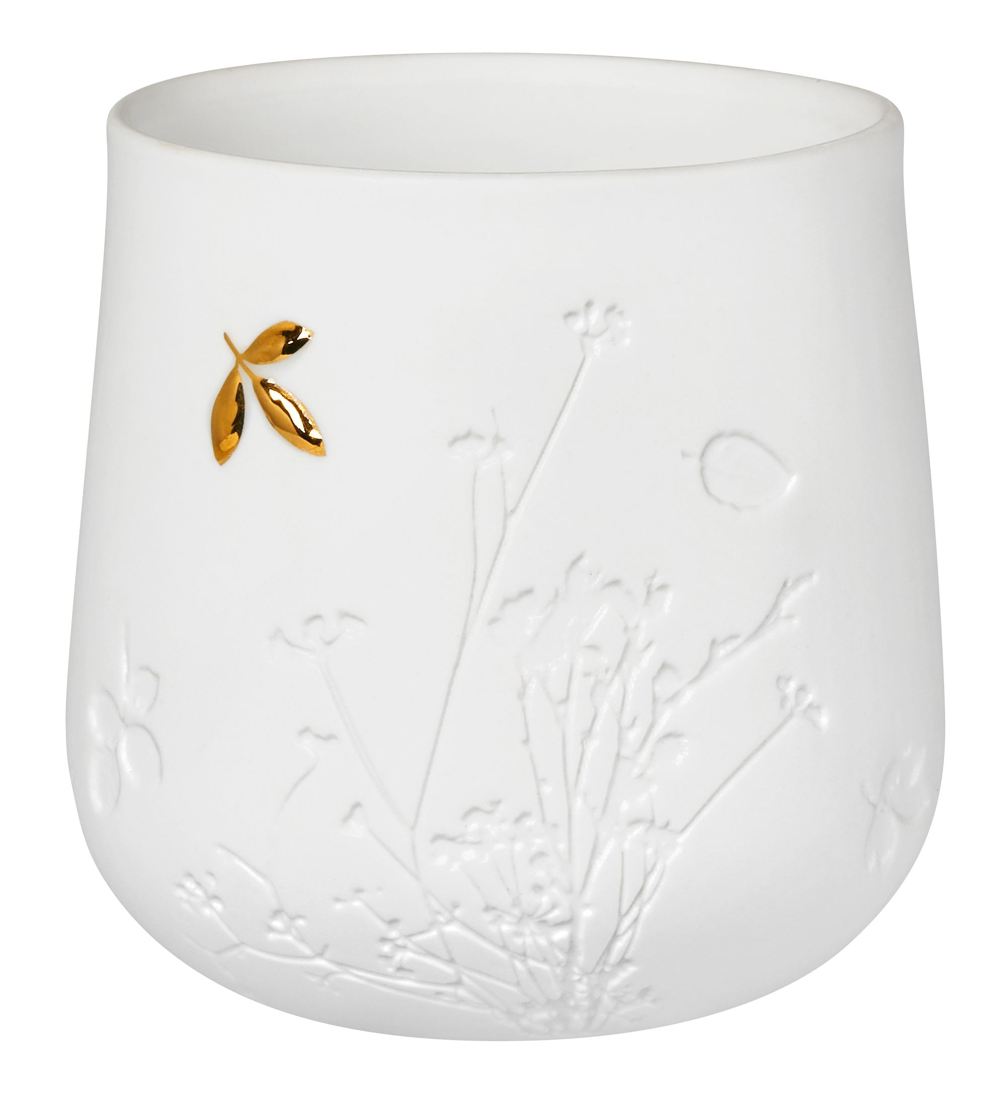 Material: weißes Porzellan, außen unglasiert, innen glasiert mit Prägung, Relief und goldenem Decal