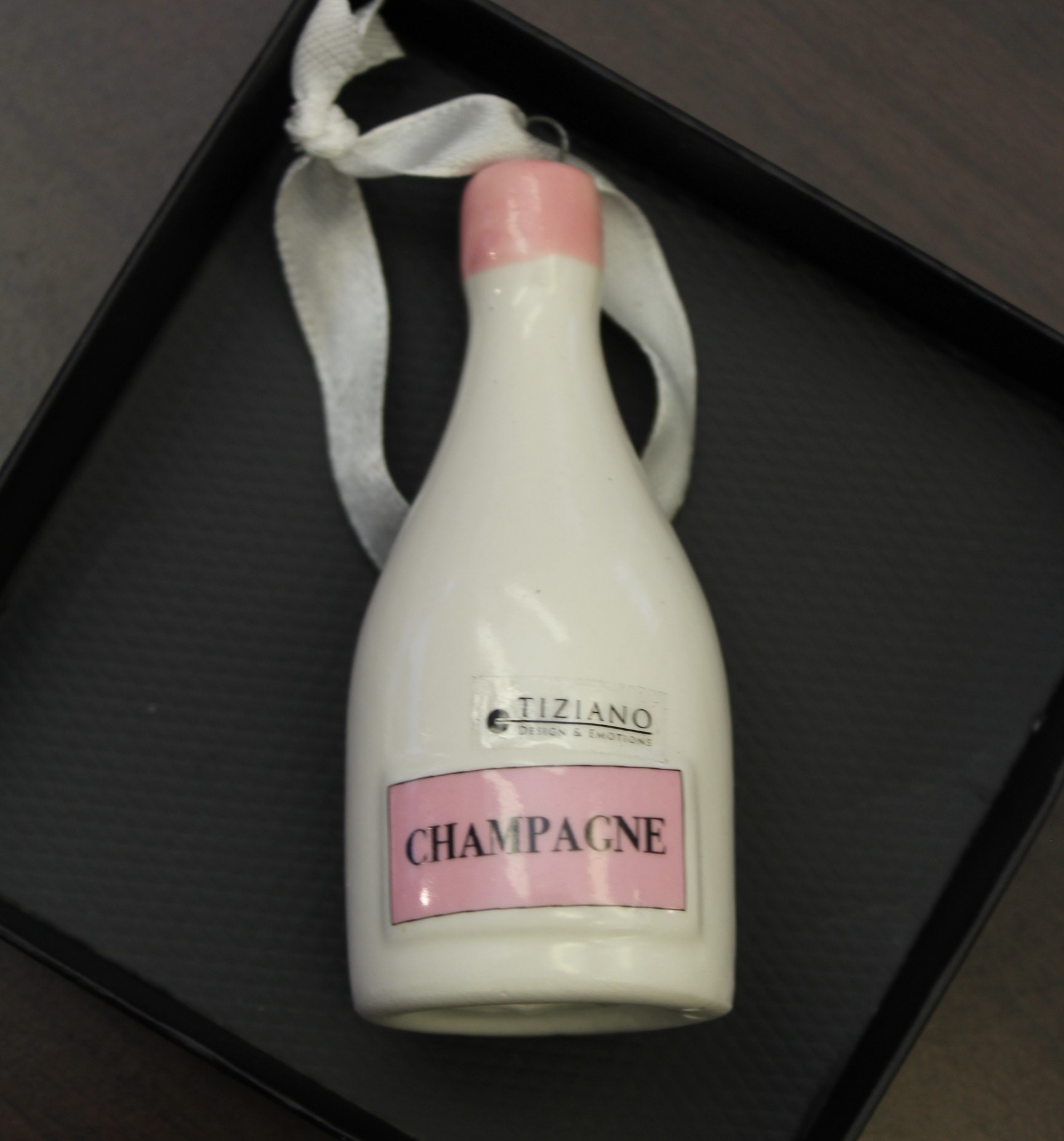 Hänger Sektflasche Festa / Lebkuchenhaus Piani / Vespa Loreo oder Helikopter Cento jeweils in schwarem Geschenkkarton. Größe ca. 7 cm.